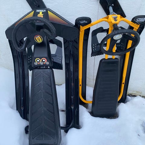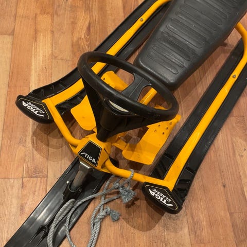 Senger en Stiga Snowracer Akebrett med ratt og brems.