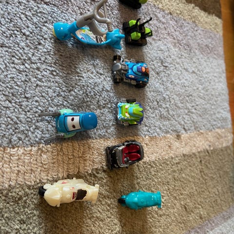 Tre biler og en gravemaskin i fin stand. Opptrekkbar monstertruck. Lastebil og søppelbil ca 20 cm lang. Gravemaskin og monstertruck ca 15 cm lang.