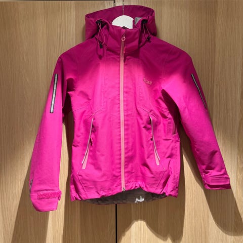 Bergans barnejakke i Gore-Tex materiale, rosa farge, størrelse 140, tilpasset for jenter. Jakken har flere glidelåslommer og hette, egnet for utendørs bruk med værbeskyttelse. Et par sorte merke på jakken- se bilde.