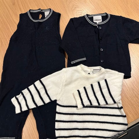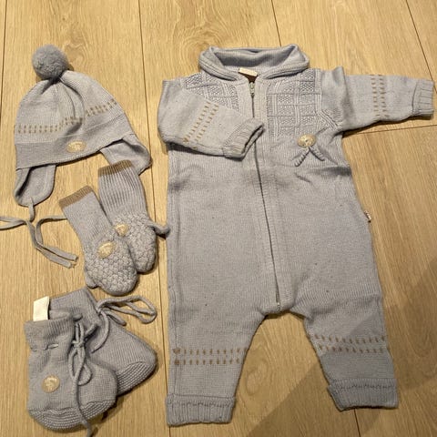 Ullpakke med sparkedress, votter og lue fra Lillelam. I 100% myk merinoull. Settet er pent brukt uten hull eller flekker.