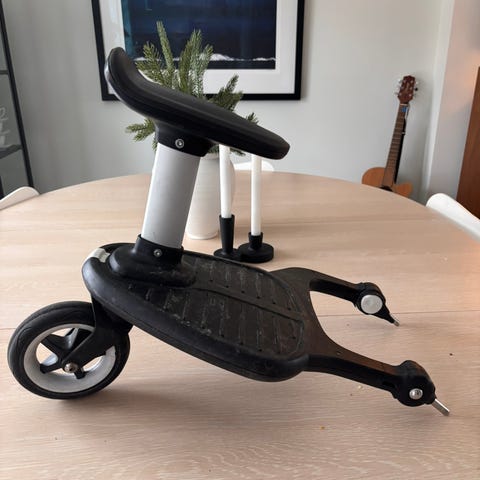 Bugaboo ståbrett med sete designet for å festes til barnevogner. Produktet har et integrert sete og hjul for enkel bruk og mobilitet. Passer for barn som ønsker å sitte eller stå mens de blir dratt med barnevognen.