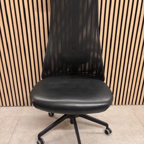 Enkel kontorstol med justerbar høyde og fem hjul. Svart rotting, med en behagelig grå sittepute med vaskbart trekk.