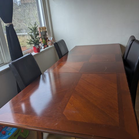 8 spisestuestoler i heltre bøk med grønt trekk til salgs. Stolene er i god kvalitet. De har noen mindre flekker på noen av stoltrekkene.