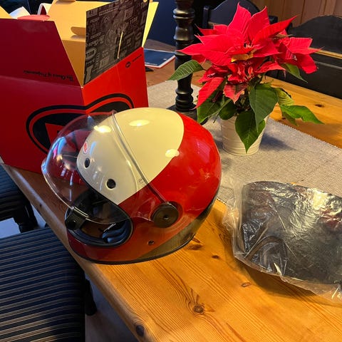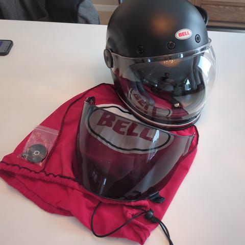 Halv hjelm som passer seg til skuter eller moped kjøring. Det står ikke støresle i den men passer meg som bruker large. Hjelmen er ikke brukt. Jeg har ikke kvittering fordi det var en gave.