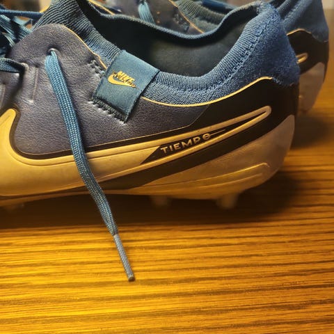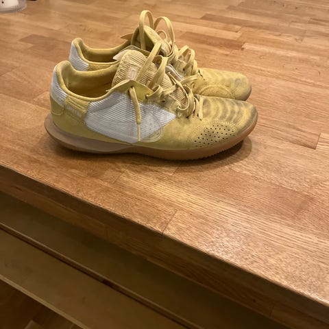 Nike fotballsko i størrelse 41, gul og hvit farge. Skoene er laget av syntetisk materiale og har gummikonstruksjon på yttersålen for bedre grep. Egnet for bruk på innendørs fotballbaner.