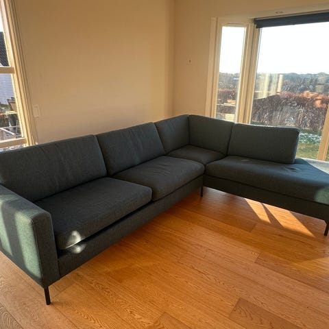 Sofa fra Hjellegjerde i dempet blå/grå (dusty blue). Kun stått i stue som er lite brukt. Ingen synlige bruksmerker eller flekker.