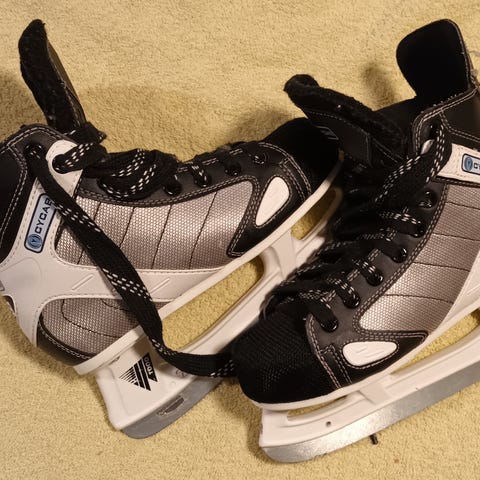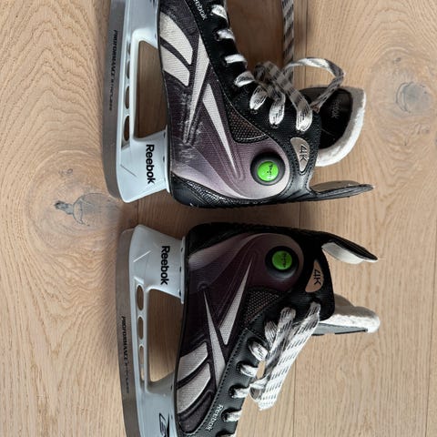 Reebok Ishockey skøyter for barn i størrelse 34. Skøytene har en kombinasjon av hvit og rosa farge.