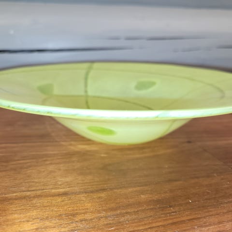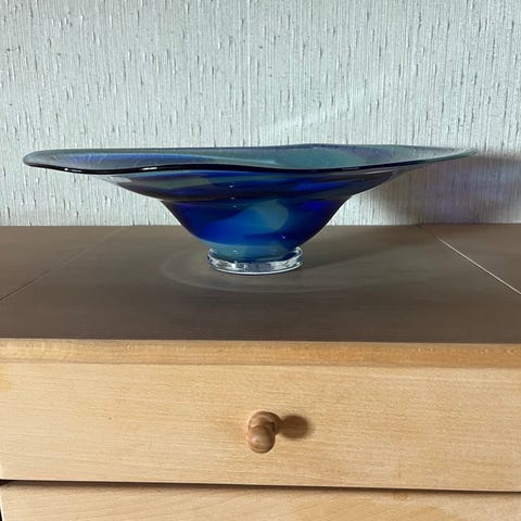 Ubrukt, Irene Harvik glasskål med dekorative røde og hvite mønstre. Skålen har en unik form med bred åpning og smal base, laget i glass. Passer til dekorasjon eller oppbevaring av små gjenstander.