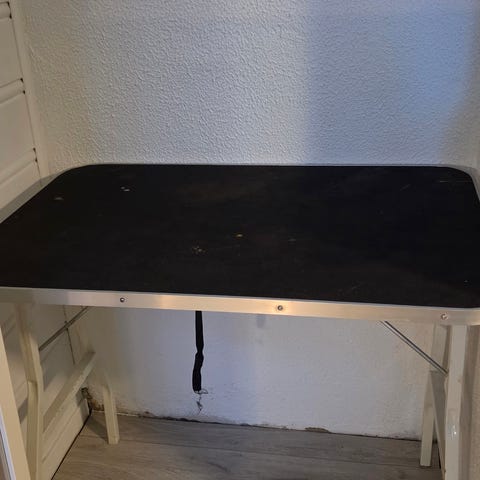 Sammenleggbar bord med grønn bordplate og hvite metallben. Bordet har et håndtak for enkel transport og oppbevaring.