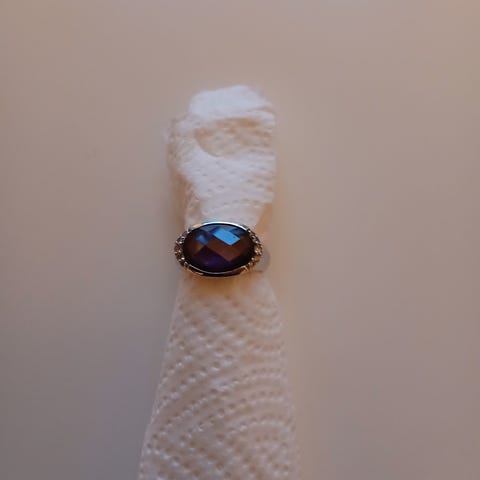 Et sølvfarget smykke med lilla «stein»