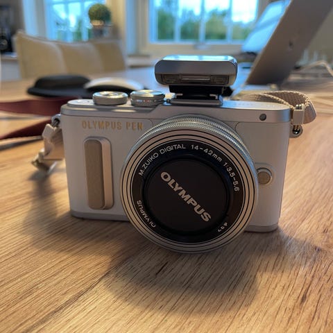 Olympus PEN E-PL7 hybridkamera i kvit farge. 14-42 mm objektiv, og LCD skjerm som kan vippast. Lite kamera med retro design.