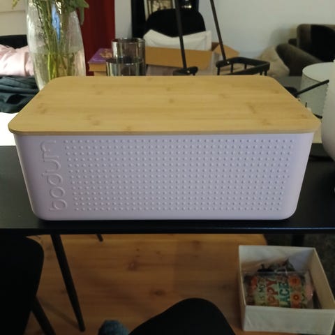 Bodum brødboks i svart med lokk i bambus. Lokket kan brukes som brødfjøl, men vi har ikke brukt det til dette, så det er uten merker. Noen veldig små merker i plasten som nesten ikke synes.