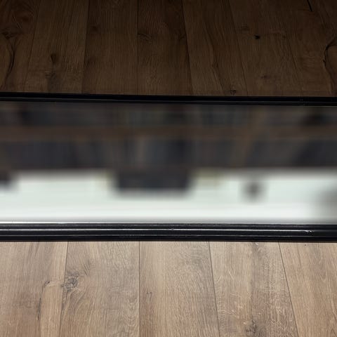 Speil med sort ramme selges rimelig. Speilet er svært solid, og veier litt. Kan henges loddrett (med to fester på baksiden), eller plasseres vannrett på en sjenk eller lignende. Mål; 60 x 80 cm.