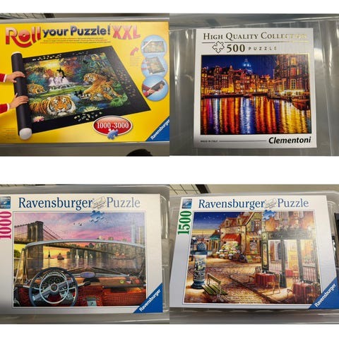 Selges for 100kr stykk, hvor de fleste er puslet én gang og mangler ingen brikker