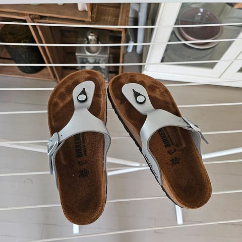 Birkenstock sandaler i størrelse 39. Sandalene har to justerbare remmer i gul farge og en såle med korkmateriale. Egnet for daglig bruk. De er veganske og ganske lite brukt. Litt skitne under, men det kan nok vaskes bort. Fin til sommer.