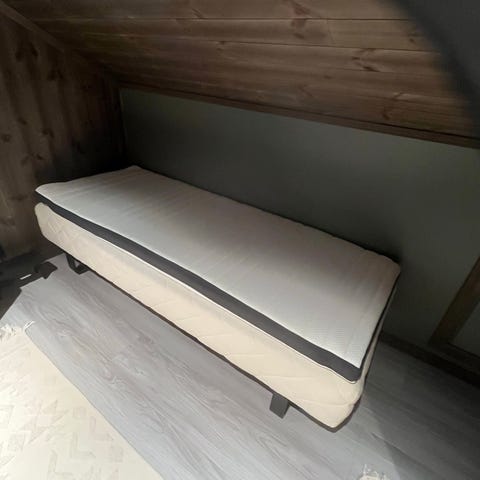 Fin dobbeltseng 180x200 som består av to rammemadrasser 90x200 og dobbel mellommadrass med avtagbart trekk. Ukjent merke. Ny overmadrass på toppen av merke Jysk.