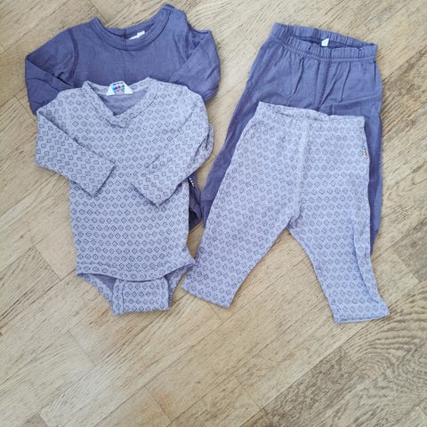 Merinoull fra joha 2 stk bodies,grønn i størrelse 60, grå i str. 70. Den grå har en liten blåbærflekk. Body med knapper fra we str.60/70. Dress med knapper fra janus str. 60, blå font fra Cubus str. 62-69, blå body fra devold str.74. Alt er merinoull bortsett fra Devold-body, som troligvis er polyester.