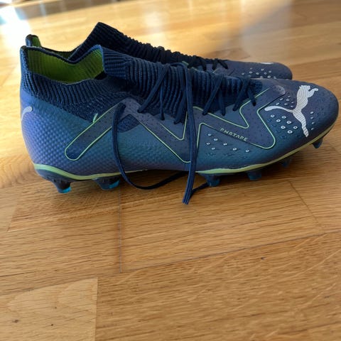 Puma fotballsko i blå farge med grønne detaljer på sålen. Skoene har knotter under for bedre grep på gressbaner. Egnet for bruk på fotballbaner.