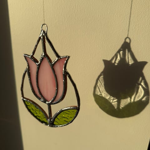Solfangeren er laget med klassisk tiffany-teknikk som går ut på at man lodder sammen glassbiter med kobberfoil og tinn. Fargene gir et vakkert spill når sola treffer den ☀️