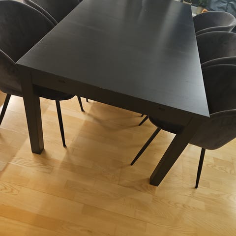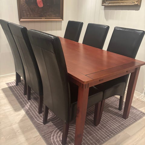Spisebord i god stand inkludert 4 spisestoler med noe slitt trekk (flekker kan forekomme)