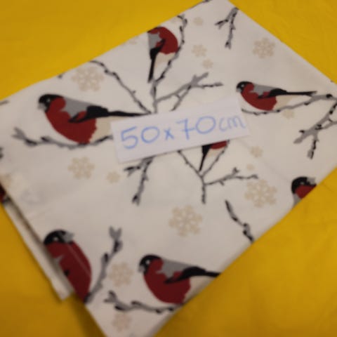 Koselig juleduk (79x87,5 cm) med utradisjonell bunnfarge. Bunnfargen er brun med en 4,5 cm bred hvitlig kant ytterst. Påtrykket julemotiv med nisser, støvler, juleklokker, julelys, etc. Kommer fra arvebo. Duken ser ny og ubrukt ut. En liten feil i vevingen (siste bilde).