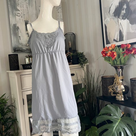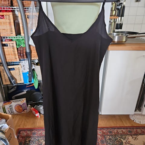 Pen underkjole med blonder og justerbare stropper. Klippet av lapper, og husker ikke merket. Stretch i stoffet. Ca 80 cm lang