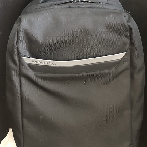 Den har vannavstøtende materiale foran, med liten glidelås lomme. Og en liten glidelås lomme øverst i sekken som er fin til småting som AirPod/pass osv