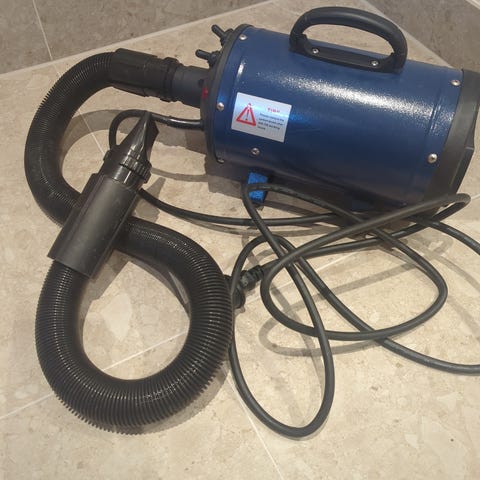 Håndholdt tørker for kjæledyr med kraftig effekt. Modellen er beregnet for tørking av kjæledyr med håndholdt bruk. Enheten har en fleksibel slange og er designet for effektiv luftstrøm. 2 effekt trinn, og trinnløs regulering av varme fra 43 til 65 grader C. Brukt ca 5 ganger. Bruksanvisning og original emballasje følger med. Tilsvarende ny koster ca 1700-2000 i dag. Ingen pruting.