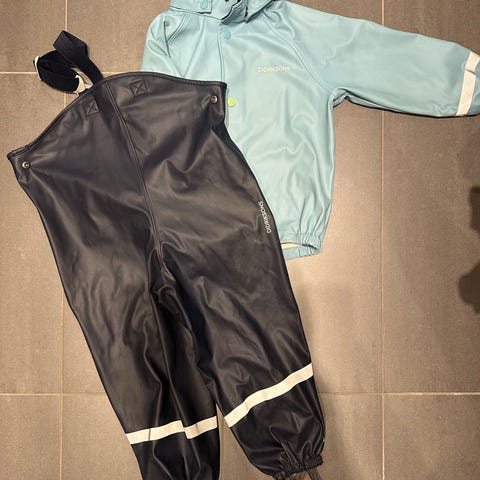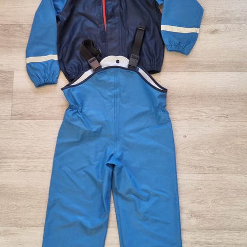 Pent brukt rosa og blått regntøy i strl. 110.