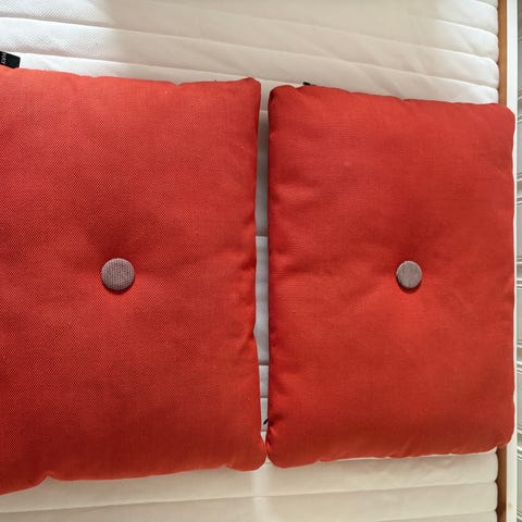Har flyttet og disse fine putene fra Hay passer ikke inn lenger. To av putene har ulik farge på knappen på de to sidene. Det er et par mindre flekker på putene, ellers i god stand.