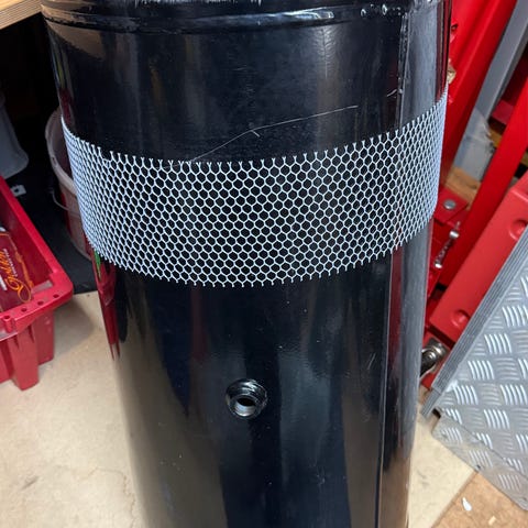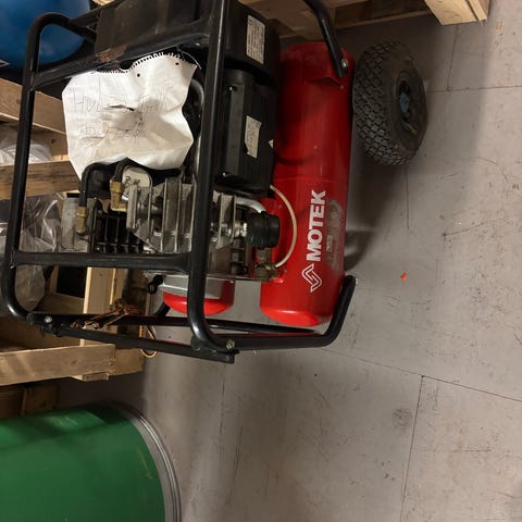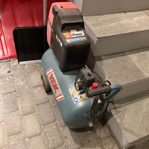 Cobe 50/3SVL kompressor med lufttank, hjul for mobilitet og luftslange. Egnet for bruk i verksted eller til luftverktøy.