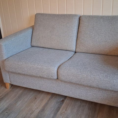 Den har hatt katt i hus,men sofaen er renset. Litt solfalmet bak på sitteptene,. Ikke så synlig. Den er veldig god å sitte i. Lite brukt.