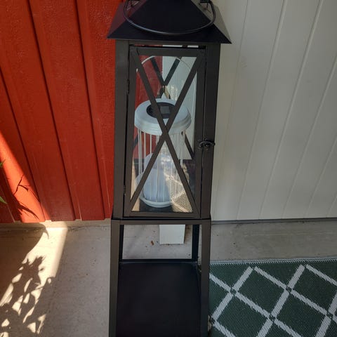 Står bare ett kubbelys i den på bildet, men det er plass til ca tre stk lys i den. Har alltid stått innendørs.
