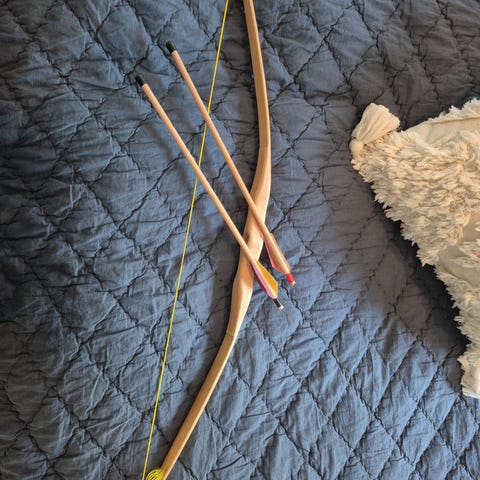 Håndlaget og håndmalt to lekeskjold , en sverd og to hammere, lager av finer og tre. Selges helst samlet