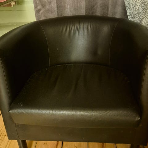 Lenestoler i brunt skinn med polstret rygg og armlener. Passer for enkel sitteplass i stue eller kontor. Veldig god å sitte i! Prisen er per stol.