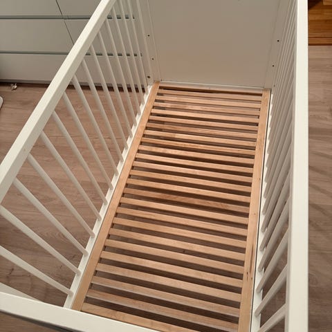 IKEA Sprinkelseng barneseng med hvit finish. Passer for barn opp til 60 cm i høyde og 120 cm i lengde. Laget i tremateriale med spiler på alle sider for sikkerhet og ventilasjon. Inkluderer en tilpasset madrass.