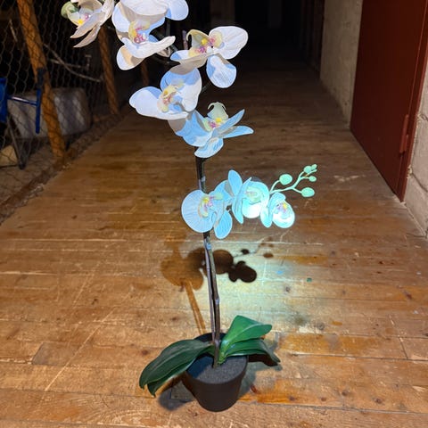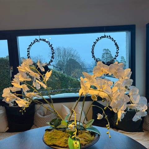Flott og stor kunstig naturtro orkidé dekorasjon i hvit farge. Dekorasjonen består av flere stilker med detaljerte blomster som etterligner ekte orkidéer. Egnet for innendørs bruk som dekorasjon. 97 cm høy.