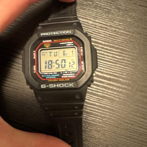 Casio G-Shock GW-M5610U-1ER digital klokke for unisex. Klokken har støtbestandig konstruksjon, 20 BAR vannmotstand, radiokontrollert tidssynkronisering for flere regioner (inkludert USA, Japan, Kina og Europa). Solcelledrevet med funksjoner som stoppeklokke, tidtaker, alarm, verdensklokke og full auto LED-bakgrunnsbelysning.