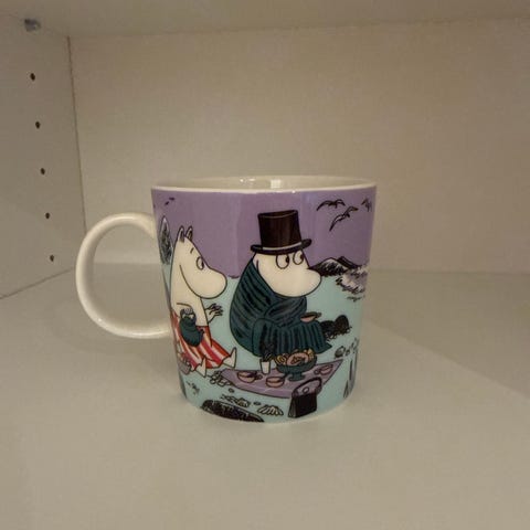 Arabia Moomin krus laget av emaljert stål og porselen med motiver fra Mummitrollet. Passer til servering av varme og kalde drikker.