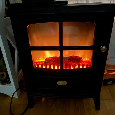 Elektrisk peisovn i sølv med glassfront og dekorative vedkubber. Egnet for innendørs bruk som varme- og stemningskilde. Kompakt størrelse som passer til mindre rom.