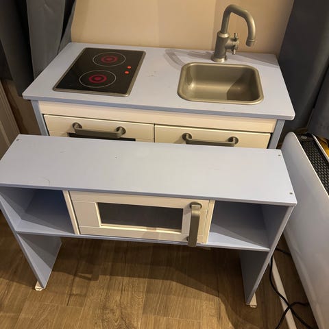 Godt brukt lekekjøkken, men har fortsatt mye lek igjen! Den ene døren har løsnet, men kan nok festes på nytt. Kokeplaten har en liten sprek, men funker fortsatt fint.