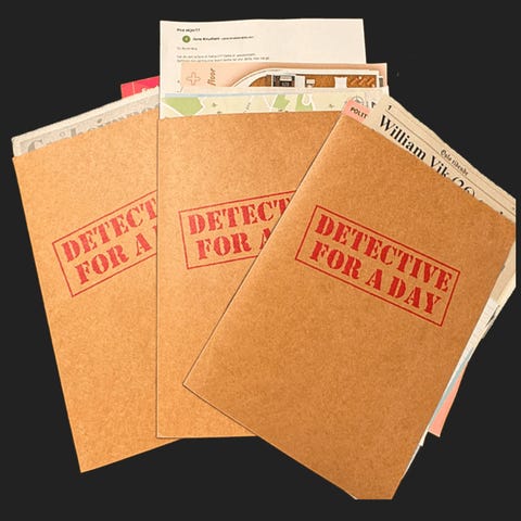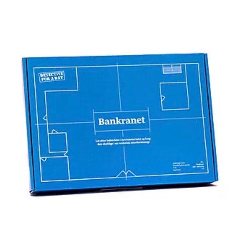Detective for en dag Bankranet brettspill. Inneholder spillkomponenter for en detektivopplevelse med fokus på en bankran-sak.