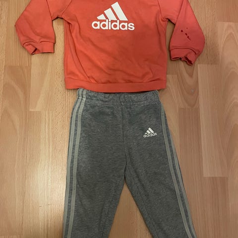 Adidas treningsoverall for barn i størrelse 86. Settet består av genser og bukse i mørk farge med Adidas-logo og de karakteristiske tre stripene på siden av buksen.