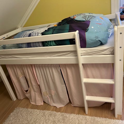 Hoppekids halvhøy seng / loftseng i hvit farge. Sengen har gardin, og under sengen kan det lages lekeområde.