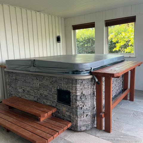 Selger nå massasje badet våres, da det ikke blir brukt dessverre. da vi kjøpte det hadde det stått uten strøm 1 måned midt på vinteren. Jeg har byttet pumpe og 2 slanger som var sprekt så det er helt i orden nå. Lokket har fått seg en bulk etter att det sto uten strøm, det samlet seg snø oppå det, men vi har brukt det som det er.