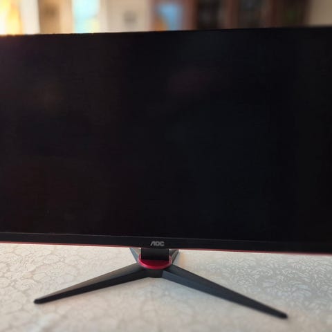 Selger AOC 27 tommer gamingskjerm. Hvit strek går over skjermen, men plages ikke mye av dette i spill. Når det er helt hvitt eller veldig lyst, begynner den å flimre litt under streken.
