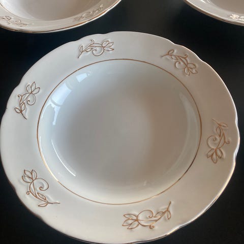 Består av grønne tallerkener/asjetter, gule kaffekopper med skåler, samt serveringsdeler.