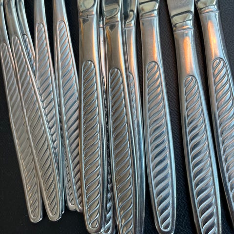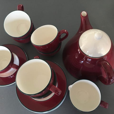 Pent retro keramikkservise, som etter form, farger og riflet dekor trolig er Atlantic‑serviset fra Egersund Fayance.
