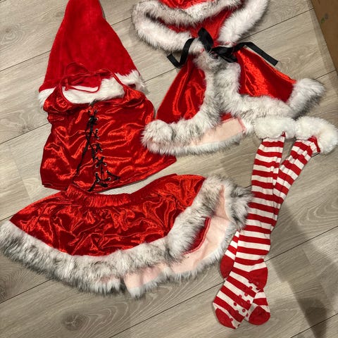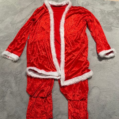 Unisex julekostyme bestående av en rød jakke med hvite kanter og matchende røde bukser. Laget av mykt fleece stoff. Buksen er stor i str, jakken og lue passer fint til 1,5-2,5 år (kort i armene på vår 3åring)
