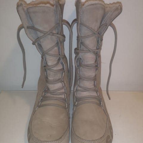 SOREL vinterstøvler i brunt semsket skinn med ullfôr. Merket str. 38, men små i størrelse, så de tilsvarer 37. Støvlene har snøring foran og er laget for vinterbruk.